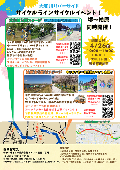 今回は堺市・水辺の楽校・柏原市など様々な自治体や企業と共催でサイクルイベントを開催します!