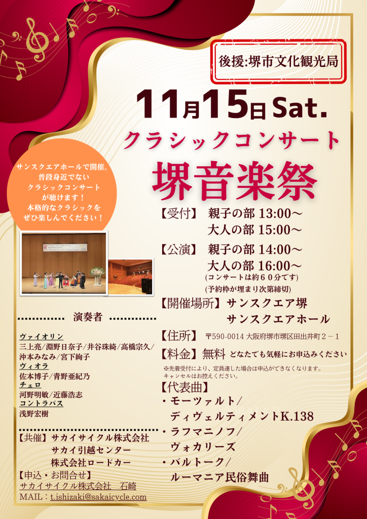 サンスクエア堺で開催される本格的なクラシックコンサートにご招待いたします!
